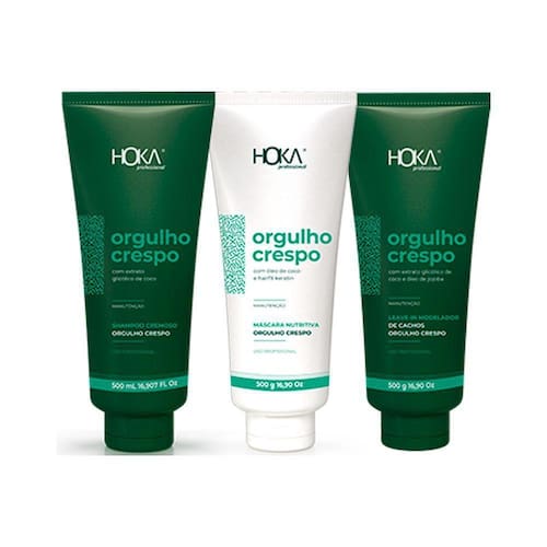 Kit Orgulho Crespo - Hoka ProfessionalShampoo Cremoso Orgulho Crespo 500mlMáscara Nutritiva Orgulho Crespo 500gModelador de Cachos Orgulho Crespo 500gA linha Orgulho Crespo Hoka Professional foi desenvolvida para tratar,Modelar e realçar os cabelos cacheados. Por ser enriquecida com óleo deCoco, óleo de jojoba e Hairfit Keratin que são ativos que doam aos fios brilhoE hidratação intensa, seus benefícios se classificam em 7 tópicos, que são:Sistema de ativação de cachos, umidificação, hidratação, intensificação doBrilho, nutrição, restauração e redução de volume, garantindo assim umaMelhor modelagem aos fios ondulados.Indicação: todo tipo de cabelo, principalmente cabelo cacheado, ondulado eCrespo.Modo de usar: aplique o Shampoo Cremoso Orgulho Crespo no cabeloMolhado. Aplique a Máscara Nutritiva Orgulho Crespo massageando mechaA mecha. Deixe agir por aproximadamente 7 minutos. Enxágue bem. ApósLavar e hidratar o cabelo, aplique uma pequena quantidade do Leave-inModelador de Cachos Orgulho Crespo sobre toda extensão dos fios. FinalizeComo desejar.Dicas: use o Modelador de Cachos diariamente sobre os fios úmidos ouSecos para reativar os cachos e diminuir o volume. Marca: Hoka Profissional