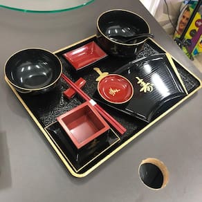 Jogo de jantar oriental com acabamento preto laqueado de excelente qualidade, alto brilho e pintura do ideograma em dourado que representa felicidade. Peças indispensáveis para amantes da culinária oriental. Cores fortes inspiradoras nas tradicionais decorações japonesas podendo auxiliar no serviço de sushis, sashimis e outras iguarias. Cuidados: - Lavar com água morna e sabão neutro utilizando esponja macia, seguido de pano seco. - Não utilizar produtos químicos ou abrasivos na limpeza. - Não vai à lava-louças.
