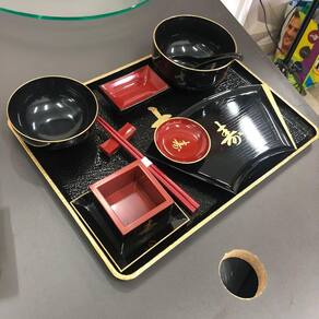 Jogo de jantar oriental com acabamento preto laqueado de excelente qualidade, alto brilho e pintura do ideograma em dourado que representa felicidade. Peças indispensáveis para amantes da culinária oriental. Cores fortes inspiradoras nas tradicionais decorações japonesas podendo auxiliar no serviço de sushis, sashimis e outras iguarias.