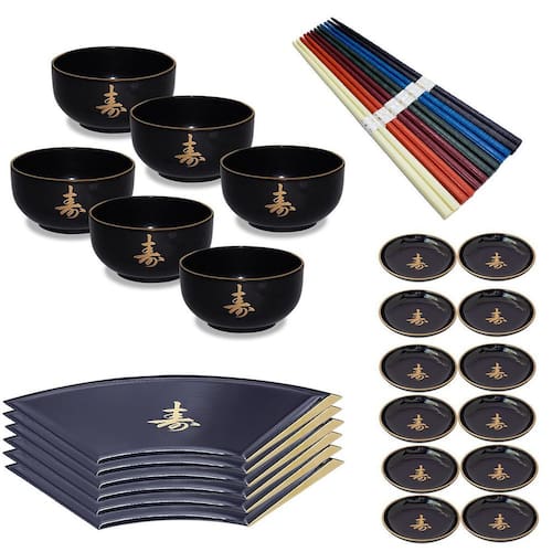 Kit oriental com acabamento preto laqueado de excelente qualidade, alto brilho e pintura do ideograma em dourado que representa felicidade. Peças indispensáveis para amantes da culinária oriental. Cores fortes inspiradoras nas tradicionais decorações japonesas podendo auxiliar no serviço de sushis, sashimis e outras iguarias.