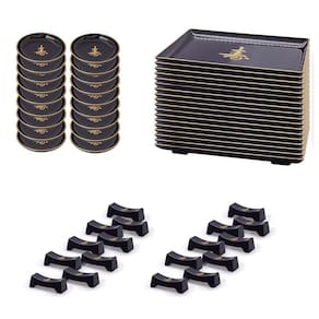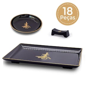 Kit oriental com acabamento preto laqueado de excelente qualidade, alto brilho e pintura do ideograma em dourado que representa felicidade. Peças indispensáveis para amantes da culinária oriental. Cores fortes inspiradoras nas tradicionais decorações japonesas podendo auxiliar no serviço de sushis, sashimis e outras iguarias.