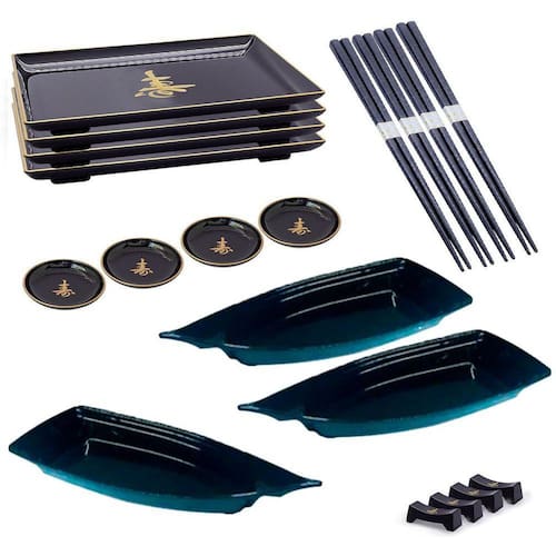 Kit oriental p/4 pessoas molheira hashi prato descanso hashiDescrição:Aprecie a culinaria japonesa entre amigos e familiares de forma tradiconalKit japonês com alto brilho e pintura de qualidadeUma peça indispensável para amantes da culinária oriental, que proporcionam refeições similares ao estilo oriental, dando o verdadeiro gostinho da experiência e complementam a decoração de sua cozinha com muito charme e bom gosto para você e para o ambiente ao redor.- essencial na cozinha para quem quer realizar pratos da cúlinaria japonesa;- preservam o sabor e a textura dos alimentos e proporcionam momentos incríveis;- jantar fica inspirador, tanto para quem vai degustar como para quem vai saborear;- valorizar muito mais à apresentação ao servir;- podendo ser utilizado por uso doméstico ou em ''restaurantes'';Cuidados:- lavar com água morna e sabão neutro utilizando esponja macia, seguido de pano seco.- não utilizar produtos químicos ou abrasivos na limpeza. - não vai a lava-louças.Características: Descanso hashi:Altura:2,2cmLargura: 1,8cmComprimento: 5,4cmComposição: a.B.SMolheira:Altura: 1,7cmLargura: 8,7cmComprimento: 8,7cmPrato retangular:Altura: 2cmLargura: 13,5Comprimento: 19cmComposição: a.B.SHashi:Espessura: 1cmComprimento: 21cmComposição: a.B.SBarca: Altura: 7cmLargura: 18cmComprimento: 42cmPeso: 0,170kgCapacidade: 1400 mlMaterial: poliestireno Cor: pretoComposição: a.B.SConteúdo:- 4 x unidades de molheiras- 4 x unidades de descanso para hashi- 4 x prato retangular - 4 x hashi - 3 x barca preta Cód.: 774/779/935/955/3t00428Sku:tb002054