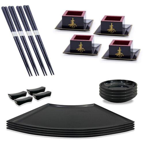 Kit Oriental P/4 Pessoas Molheira Hashi Prato Descanso SaqueDescrição:Jogo de jantar oriental com acabamento preto laqueado de excelente qualidade, alto brilho e pintura do ideograma em dourado que representa felicidade. Peças indispensáveis para amantes da culinária oriental. Cores fortes inspiradoras nas tradicionais decorações japonesas podendo auxiliar no serviço de sushis, sashimis e outras iguarias. Cuidados:- Lavar com água morna e sabão neutro utilizando esponja macia, seguido de pano seco.- Não utilizar produtos químicos ou abrasivos na limpeza. - Não vai à lava-louças.Características: Descanso Hashi:Altura:2,2cmLargura: 1,8cmComprimento: 5,4cmMolheira:Altura: 1,7cmLargura: 8,7cmComprimento: 8,7cmPrato Retangular:Altura: 2cmLargura: 13,5Comprimento: 19cmHashi:Espessura: 1cmComprimento: 21cmCopo saque:Altura: 5cmLargura: 8cmComprimento: 8cmPeso: 85 gramasEspessura da borda: 8mm.Composição: A.B.SConteúdo:- 4 x Unidades de Molheiras- 4 x Unidades de Descanso para Hashi- 4 x Prato Retangular - 4 x Hashi - 4 x Copo de Sakê 150 ml- 4 x Prato com Copo de SakêCód: 9351774177919561105730SKU: TB004823