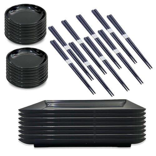 Peças indispensáveis para amantes da culinária oriental. Cores fortes inspiradoras nas tradicionais decorações japonesas podendo auxiliar no serviço de sushis, sashimis e outras iguarias.