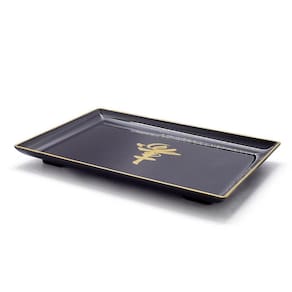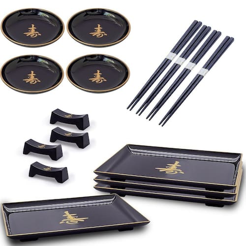 Jogo de jantar oriental com acabamento preto laqueado de excelente qualidade, alto brilho e pintura do ideograma em dourado que representa felicidade. Peças indispensáveis para amantes da culinária oriental. Cores fortes inspiradoras nas tradicionais decorações japonesas podendo auxiliar no serviço de sushis, sashimis e outras iguarias.