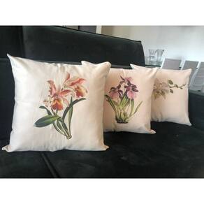 Kit Orquídeas - 3 Capas de Almofada Floral Orquídea 45x45 Kit com 3 capas de almofada Orquidea Pascoa, orquidea roxa e orquidea branca em tecido 100% algodão, com toque suave pois o tecido, embora resistente, sofre peletização o que o deixa com um toque quase aveludado. A cor do tecido é 'areia' o que proporciona suavidade de fundo para as cores da estampa. Esta cor também permite inúmeras combinações na sua decoração, deixando o ambiente leve e elegante. Marca: Magnolia St.