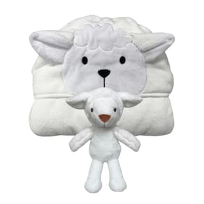 Contém 1 Toalha de Banho com Capuz (70 cm x 100 cm + capuz) 1 Bicho de Pelúcia Ovelha (25 cm x 9 cm)