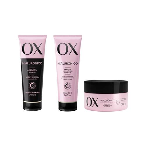 Kit ox hialurônico condicionador 240ml + shampoo 240ml + máscara 300g Descrição O kit ox hialurônico, composto por 1 condicionador de 240ml, 1 shampoo de 240ml e 1 máscara de tratamento de 300g, oferece um cuidado completo para cabelos ressecados e sem vida. Enriquecido com ácido hialurônico, o shampoo limpa suavemente, o condicionador hidrata profundamente, e a máscara proporciona um tratamento intensivo, restaurando a umidade natural dos fios. O resultado são cabelos macios, brilhantes, hidratados e com movimento leve e natural. Modo de uso Shampoo ox hialurônico 240ml Aplique o shampoo nos cabelos molhados, massageando suavemente até formar espuma. Enxágue bem e, se necessário, repita o processo. Condicionador ox hialurônico 240ml Após lavar com o shampoo, aplique o condicionador nos cabelos úmidos, distribuindo do comprimento às pontas. Deixe agir por 2 a 3 minutos e enxágue completamente. Máscara ox hialurônico 300g Aplique a máscara nos cabelos limpos e úmidos, distribuindo uniformemente do comprimento às pontas. Deixe agir por 5 a 10 minutos para uma hidratação profunda. Enxágue bem. Use 1 a 2 vezes por semana para resultados mais intensivos. Marca: Não Informado
