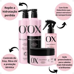 A Linha OX Hialurônico é a ideal para cabelos desidratados e opacos. Isso porque a combinação do Ácido Hialurônico, com o Sistema OX Beleza Duradoura, é a fórmula certa para cabelos mais macios, brilhantes e com vida, por muito mais tempo. Ácido Hialurônico possui estrutura de nanopartículas, que age diretamente preenchendo os poros dos fios.