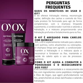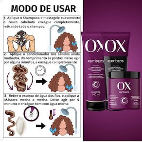 O Kit OX Peptídeos foi desenvolvido especialmente para cabelos crespos, cacheados e ondulados que precisam de hidratação, nutrição e definição intensiva. Com uma fórmula rica em peptídeos e ativos nutritivos, este kit é a solução perfeita para manter seus fios saudáveis, controlados e com cachos definidos. O Shampoo OX Peptídeos limpa profundamente sem agredir os fios, removendo impurezas e resíduos, enquanto mantém a hidratação natural dos cabelos. Sua fórmula suave e sem sulfatos proporciona uma limpeza eficaz sem ressecar ou danificar os cachos. O Condicionador OX Peptídeos possui uma fórmula enriquecida com peptídeos e ativos que nutrem e protegem os fios, o Condicionador OX Peptídeos hidrata profundamente, promovendo maciez e suavidade. Ele sela a hidratação, controla o frizz e ajuda na definição dos cachos, garantindo cabelos mais disciplinados e brilhantes. A Máscara OX Peptídeos proporciona uma hidratação intensa e regeneração profunda dos fios. Ideal para um tratamento mais potente, ela age para restaurar a saúde e a vitalidade dos cabelos crespos, cacheados e ondulados, ajudando a recuperar o brilho, a maciez e a definição dos cachos. Sua fórmula contém peptídeos que fortalecem a fibra capilar e evitam o ressecamento, deixando os fios mais sedosos e bem cuidados.