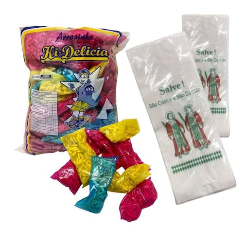 Contém: 1 pacote com 300 un saquinhos Pipocas Flocos de Arroz Doce + 300 un saco de papel 9x27cm cosme e damião