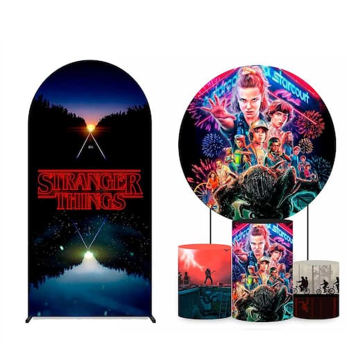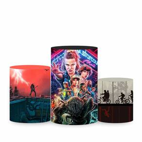 Kit Painel de Festa Redondo 1,30m, Trio de Cilindros e Painel Romano Stranger Things - Fera Print - Cor: Stranger Thinks 3