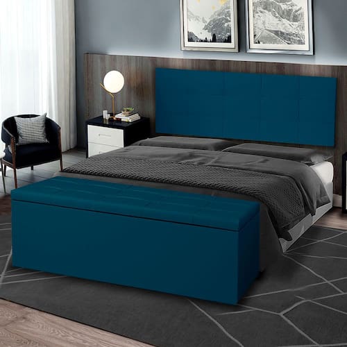 Kit Painel e Calçadeira Baú Roma Solteiro 90cm Suede Azul - Montanaris Decor