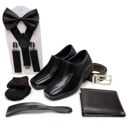 Kit Pajem Casamento Sapato Social Infantil Cinto Carteira Suspensorio Gravata Borboleta Calçadeira Meia - 23 - Preto