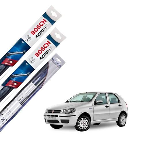 Aplicação: fiat palio g3 2004 a 2011 atenção verifique se o encaixe traseiro é igual a ultima foto itens: 2 palhetas dianteiras bosch aerofit 1 palheta traseira marca vetor características: para aplicações com conexão gancho