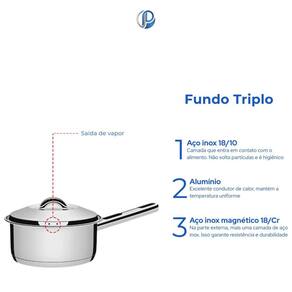 Panela Tramontina Solar 16 cm - Material: Aço inox Diâmetro: 16 cm Capacidade: 1,4 litros Altura: 11,3 cm Espessura: Fundo triplo aço inox + alumínio + aço inox Compatibilidade: Fogão a gás, elétrico, vitrocerâmico e indução Forno: Até 260 C Acabamento: Polido em alto brilho Tampa: Em aço inox com saída de vapor Cabos e alças: Rebitados em aço inox resistentes e seguros
