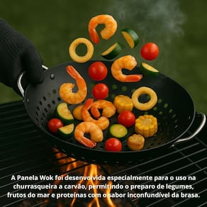 A Panela Wok foi desenvolvida especialmente para o uso na churrasqueira a carvão, permitindo o preparo de legumes, frutos do mar e proteínas com o sabor inconfundível da brasa. Com paredes altas, ela oferece espaço para mexer e misturar os ingredientes de maneira uniforme, garantindo um cozimento perfeito e proporcionando a versatilidade necessária para pratos maiores e mais variados.