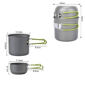 Kit de Panelas para Camping com 2 peças Este kit de cozinha conta com 2 panelas. As panelas são feitas em alumínio anodizado, que faz com que seja sólidas e leves, e resistentes a altas temperaturas e abrasão.O kit se torna bem compacto pois os cabos das panelas podem ser dobrados e as panelas e demais itens se encaixam uns nos outros. O kit pode ser armazenado em um saco de rede para o transporte.É próprio para Camping, Caminhadas, Acampamentos, Piqueniques e Outras Atividades Ao Ar Livre, pois é bem leve e pequeno, não ocupando muito espaço em sua mochila. Especificações:- Material: Alumínio- Panela grande Tamanho (Diâmetro x Altura): 12,4 x 10,6 cm- Panela pequena Tamanho (Diâmetro x Altura): 11,6 x 6,5 cm- Indicado para: 1 pessoa cozinhar- Embalagem: Saco de Rede para guardar- Peso: 226g Conteúdo da embalagem:- 1 x Panela Grande- 1 x Panela Pequena