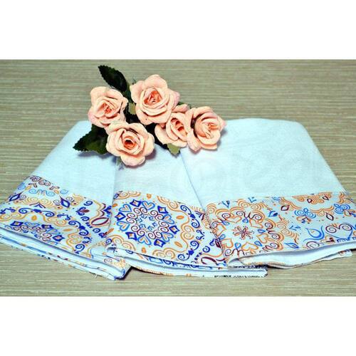 Confeccionados em tecido 100% algodão na cor branco, com barrados estampados, nas cores azul, marrom e bege. Os barrados tem em média 8 cm de altura.