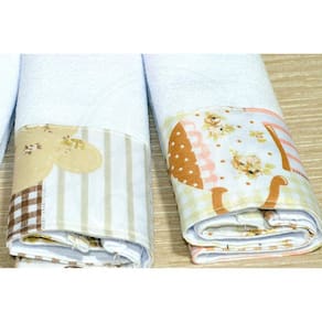 Confeccionados em tecido 100% algodão na cor branco, com barrados estampados, nas cores rosa, marrom e bege. Os barrados tem em média 8 cm de altura.