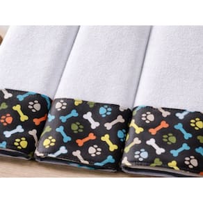 Confeccionados em tecido 100% algodão (Sacaria) na cor branco, com barrado colorido e com desenhos de patinhas e ossinhos, nas cores azul, verde, laranja e branco. Os barrado tem em média 8 cm de altura.