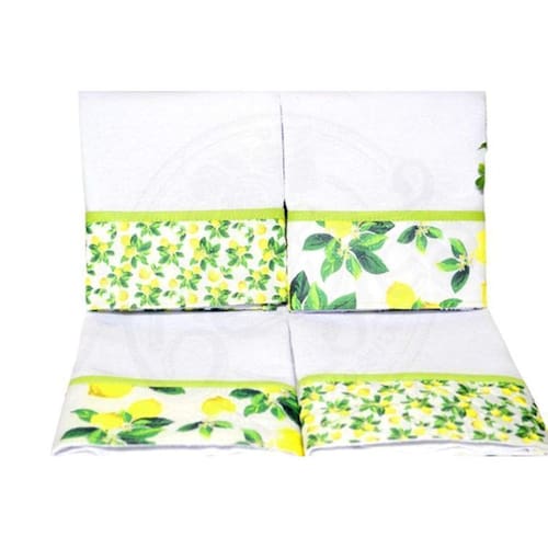 Confeccionados em tecido 100% algodão na cor branco, barrado em tecido matelado com estampa de limões sicilianos, com fundo branco e com tons de amarelo e verde, sendo dois com estampas maiores e dois com estampas menores. Detalhe em viés na cor vermelho. Os barrados tem em média 8 cm de altura.