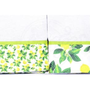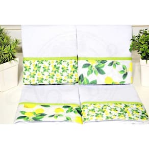 Confeccionados em tecido 100% algodão na cor branco, barrado em tecido matelado com estampa de limões sicilianos, com fundo branco e com tons de amarelo e verde, sendo dois com estampas maiores e dois com estampas menores. Detalhe em viés na cor vermelho. Os barrados tem em média 8 cm de altura.