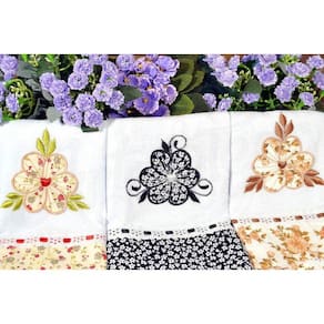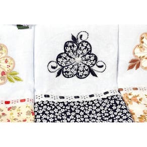 Jogo fabricado em tecido 100% algodão, com barrado em tecido floral nas cores bege e vermelo, branco e preto, e tons de marrom, com uma flor bordada e aplicada no mesmo tecido do barrado, detalhes em passa fitas.