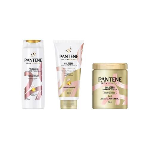 Esse kit contém: 1 Condicionador Pantene 250ml Colágeno + 1 Shampoo Pantene 300ml Colágeno e 1 Máscara de Tratamento Pantene 550ml Colágeno