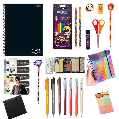Kit Papelaria Harry Potter PoterHeds Presente Bem-vindo à Kit Harry Potter aqui da Sakura Shop, onde a diversão encontra a funcionalidade Prepare-se para dar um toque adorável ao seus material de estudo. Excelente produto para presentear O Kit e composto pelos seguintes itens. 1 Caderno Universitario 5 Marca Texto Harry Potter 2 Lapis Hb Harry Potter 4 Canetas Esferograficas Pentel 3 Canetas Esferograficas 1 Lapiseira 0.7 ou 0.5 mm 1 Bloco Preto 1 Conjunto Lapis de Cor 12 Cores Harry Potter 1 cola bastao