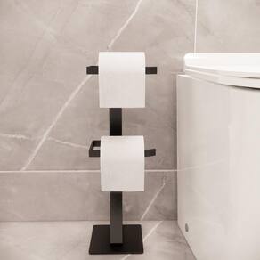 Suporte Papeleiro Chão Duplo Cor: Preto Dimensão Base: 13x13cm Altura: 50cm Largura da Hastes do Papel Higiênico: 16cm