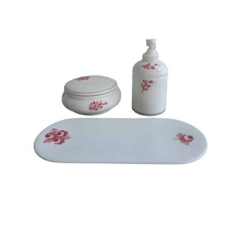 Esse lindo Kit de Banheiro com 3 Peças além de ajudar na organização da sua bancada, irá compor a decoração dando um toque de elegância e charme ao seu banheiro ou lavabo. Fabricado em porcelana espanhola o jogo é sofisticado e leve. O jogo compõe 3 peças: 1 dispenser de sabonete liquido: 15x7cm 1 pote organizador: 6x12cm 1 suporte organizador de parede: 26x2cm acompanha parafuso e bucha Material: Porcelana Espanhola Cor: Branco com Rosa Garantia: 6 meses Marca: Prana Dia Ean: 7894131757451