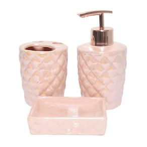 Kit para banheiro lavabo 3 peças sereia escamas perolado Cor: rosa Deixe seu banheiro ainda mais lindo com esse kit, possui pintura perolada que da ainda mais brilho e sofisticação para o ambiente, o kit conta com 1 porta sabonete liquido, 1 porta sabonete e 1 porta escovas de dente/pasta.