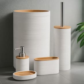 Descrição do produto Renove seu banheiro com elegância, funcionalidade e um toque natural com este kit de banheiro 5 peças com detalhes em bambu. Com design moderno, acabamento branco texturizado e tampa em bambu natural, o conjunto é ideal para quem busca praticidade sem abrir mão da estética. Fabricado em plástico resistente, o kit é fácil de limpar e durável, tornando-se a escolha perfeita para compor banheiros, lavabos ou suítes com estilo e organização. O kit é composto por uma escova sanitária, uma saboneteira para sabonete em barra, uma saboneteira para sabonete líquida, um porta objetos e uma lixeira. A escova sanitária foi projetada com cerdas longas e um design inteligente para oferecer uma limpeza mais eficiente e higiênica, pois alcança áreas do seu vaso sanitário de difícil acesso. A saboneteira para sabonete em barra conta com ranhuras, o que permite que a água escorra do sabonete, mantendo-o sempre seco, prolongando sua vida útil e sempre pronto para o próximo uso. A saboneteira para sabonete líquido é um acessório indispensável, pois proporciona uma maneira prática e higiênica de armazenar e dispensar o sabonete líquido. O porta objetos é essencial para você ter organização. A lixeira tem o tamanho ideal para o dia-a-dia com capacidade de 5 litros, e sua tampa é estilo vai e vem trazendo mais conforto e higiene. Leve mais harmonia e praticidade para seu dia a dia com o kit de banheiro 5 peças com acabamento em bambu, um conjunto funcional, bonito e perfeito para transformar seu espaço com bom gosto. Benefícios e características Plástico resistente: o kit é feito com plástico resistente e de alta qualidade. Bambu: todos os itens do kit possuem detalhes em bambu, trazendo modernidade para o ambiente. Antifungos e antibacteriano: o bambu por sua vez tem propriedades antifúngicas e antibacterianas, proporcionando um ambiente livre de bactérias. Escova sanitária: fabricada com cerdas longas, alcança áreas do seu vaso de difícil acesso. Saboneteira para barra: a saboneteira para sabonete em barra conta com ranhuras, que permite que a água escorra, e sua sabonete fique seca e pronta para uso. Saboneteira líquida: a saboneteira para sabonete líquido é um item indispensável, traz praticidade e higiene. Porta objetos: o porta objetos conta com 2 divisórias, podendo ser para escova e creme dental ou outros itens de higiene. Lixeira 5 litros: a lixeira tem a capacidade de 5 litros, tamanho ideal para o dia-a-dia, sua tampa com sistema vai e vem traz mais praticidade e higiene. Ficha técnica Marca: jolitex mek Modelo: linea Cor: branco com detalhes em bambu Itens: 1 escova sanitária, 1 porta sabonete em barra, 1 porta sabonete líquido, 1 porta objetos e 1 lixeira. Medidas: Escova sanitária: 38x9x9cm Porta sabonete em barra: 12x9x2cm Porta sabonete líquido: 13x9x9cm 200ml Porta objetos: 9x5,5x13,5cm Lixeira: 27x19x19cm 5 litros