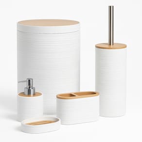 Leve mais harmonia e praticidade para seu dia a dia com o Kit de Banheiro 5 Peças com Acabamento em Bambu, um conjunto funcional, bonito e perfeito para transformar seu espaço com bom gosto.