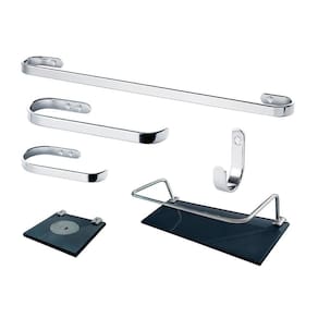 Dimensões do produto Porta toalha de rosto 17 cm Porta toalha de corpo 42 cm Cabide 7 cm Papeleira 13 cm Porta shampoo de vidro com proteção 10 x 30 cm Saboneteira reta de vidro 10x12 cm