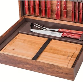 Com a faca para carne, o garfo trinchante e a tábua o kit fica completo e agrada todos os tipos de churrasqueiros.