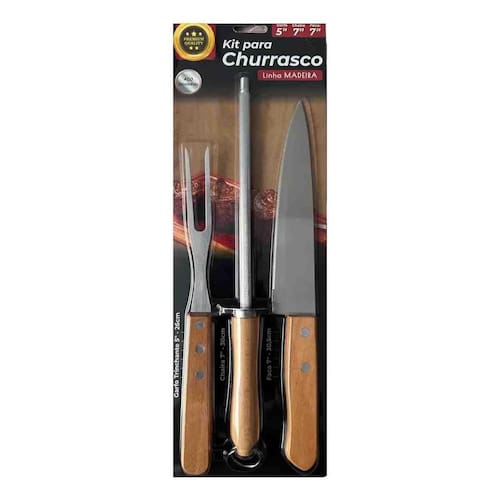 Jogo para Churrasco 3 PEÇAS com Lâminas em Aço Inox e Cabos de Madeira Natural 3 Peças você irá servir as melhores carnes de um jeito prático e saboroso. São três peças ideais para levar bom gosto e sofisticação à este momento. Com lâmina em aço inox, a faca de 7 polegadas possui maior durabilidade do fio devido ao tratamento térmico. O garfo e pegador contam com maior espessura e uma estampagem do aço que garante maior resistência, evitando deformações. São peças com cabo de madeira natural que deixam a mesa do churrasco ainda mais bonita.