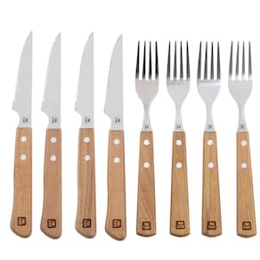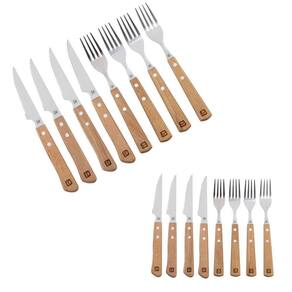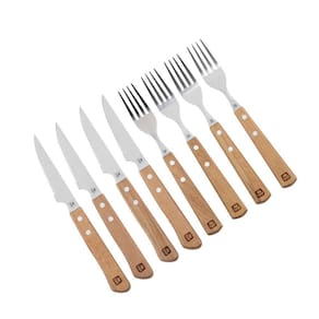 Os utensílios são feitos de aço inox, o que lhes confere maior resistência e durabilidade. Possuem cabo de madeira longo, proporcionando um manuseio mais seguro contra altas temperaturas. São perfeitos para o preparo de carnes no churrasco.