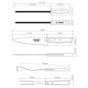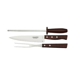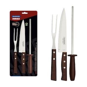 Kit Para Churrasco Tramontina Aço Inox Madeira Natural E Polipropileno 3 Peças O kit para churrasco Tramontina com lâminas em aço inox e cabos de madeira Natural e Polipropileno 3 Peças da linha Churrasco vem com faca para carne e garfo trinchante com lâminas em aço inox, além de cabos de madeira natural e rebites de alumínio. E para completar, uma chaira com haste em aço carbono cromado e cabo de polipropileno. É o kit básico de qualquer churrasqueiro. Porque todo churrasqueiro que se preze tem que ter sua própria faca Tramontina. É kit de fábrica - Sim Modelo - 22299055 Cor - Madeira natural Quantidade de Peças - 3 Peças Material Cabo - Madeira Linha ou Coleção - Churrasco Quantidade de Peças - 3 Composição - 1 Chaira 8 Carbono;1 Faca Peixeira 7 Tradicional;1 Garfo trinchante Tradicional Material - Aço Inox Material do Cabo - Madeira Cor - Marrom Mais Informações - As lâminas da faca e garfo são de aço inox e cabos de madeira natural.A lâmina da faca têm maior durabilidade do fio devido ao tratamento térmico.A lâmina do garfo conta com maior espessura e uma estampagem do aço que garante maior resistência, evitando deformações.Chaira com haste de aço carbono revestida com cromo-duro que garante uma maior durabilidade e precisão para a afiação. E cabo de polipropileno.Rebites de alumínio. Ambiente - Cozinhas Peso - 0.26 Kg do Fabricante - 3 meses para defeitos de fabricação EAN - 7891112199811