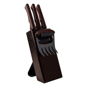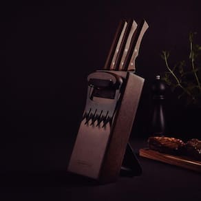 Mais Informações - Lâminas de aço inox escurecido. Resistentes e robustas.Cabos de madeira com design anatômico que tornam o uso muito mais confortável.Rebites em aço inox escurecido.Suporte para facas de madeira.
