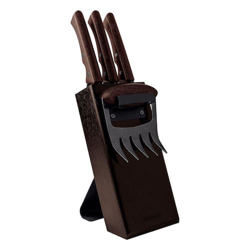 Para preparar, cortar e servir aquela carne assada deliciosa, o kit para churrasco Tramontina Churrasco Black com lâminas de aço inox escurecido e cabos de madeira 05 peças. Composto por três facas de funções variadas e uma garra multiuso garantirá maior praticidade e versatilidade para seu dia a dia. Suas peças são desenvolvidas com lâminas em aço inox escurecido e contam com cabos de madeira, rebites de aço inox escurecido e design anatômico, que tornam o uso muito mais firme e confortável. Além de todas essas características, as facas são resistentes, duráveis e vem com suporte de madeira que garante maior organização e funcionalidade na hora de guardá-las!