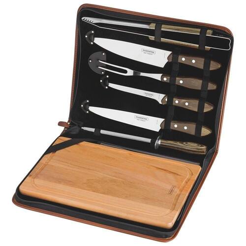 Kit Para Churrasco Tramontina Em Aço Inox Cabo Castanho Polywood Com Tábua E Estojo 8 Peças Tramontina Kit para Churrasco Tramontina em Aço Inox Cabo Castanho Polywood com Tábua e Estojo 8 Peças Tramontina - Com o Kit para Churrasco Tramontina em Aço Inox Cabo Castanho Polywood com Tábua e Estojo 8 Peças você terá um kit completo para preparar e servir o melhor churrasco. Tornando o ato do churrasco em um verdadeiro ritual. Facas e o pegador possuem lâminas em aço inox, a chaira vem com haste de aço carbono cromado. Com cabos de madeira tratada Polywood, resistentes à impactos e altas temperaturas, oferecendo beleza para todas as ocasiões. Além de um estojo sintético e tábua de madeira. A linha Churrasco é ideal para todo churrasqueiro que deseja fazer bonito.OrientaçõesAs lâminas das facas, garfo e pegador são de aço inox. As lâminas das facas têm maior durabilidade do fio devido ao tratamento térmico. As lâminas do garfo e do pegador contam com maior espessura e uma estampagem do aço que garante maior resistência, evitando deformações. Chaira com haste de aço carbono revestida com cromo-duro que garante uma maior durabilidade e precisão para a afiação. Os cabos de madeira tratada Polywood são resistentes à impactos e alta temperaturas garantindo maior resistência e durabilidade. Rebites de alumínio. Tábua de madeira ideal para cortar e servir. Estojo sintético que oferece uma proteção as peças, permitindo o transporte e armazenagem com maior segurança. Podem ir à máquina de lavar louças facilitando seu dia a dia.ObservaçõesTenha cuidado ao manusear produtos cortantes e perfurantes e mantenha-os fora do alcance das crianças. Para maior durabilidade dos produtos recomenda-se secar bem antes de guardar, mesmo após lavagem em máquina. Para descarte dos produtos e embalagens siga as orientações de reciclagem vigentes.Características GeraisEAN137891112175112DUN1417891112175119NCM8211.10.00Peso Líquido2,8100 kg.Peso Bruto3,0250 kg.Metragem0,085820 m.Dimensões Embalagem (Compr. X Larg. X Alt.)405x 325x 62 mm.Cor 14E3629 Hexa Características Gerais do Produto: Garantia: - 1 Ano