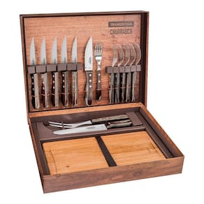 Kit para Churrasco Tramontina com Lâminas em Aço Inox e Cabos em Madeira Polywood Castanho com Caixa de Papelão 15 Peças As lâminas das facas e garfos são de aço inox. As lâminas das facas têm maior durabilidade do fio devido ao tratamento térmico. As lâminas dos garfos contam com maior espessura e uma estampagem do aço que garante maior resistência, evitando deformações. Os cabos de madeira tratada Polywood são resistentes à impactos e altas temperaturas garantindo maior resistência e durabilidade. Rebites de alumínio. Tábua de madeira ideal para cortar e servir. Caixa de papelão.Podem ir à máquina de lavar louças facilitando seu dia a dia.
