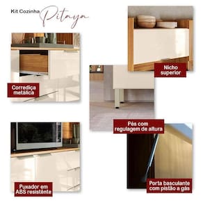 Precisando de móveis para sua cozinha?. Apresentamos esse lindo kit cozinha da linha Pitaya, fabricado pela Demóbile desenvolvido 100% em MDP. Possui espaço para acomodar micro-ondas. Possui 6 portas, prateleiras, nicho para ser como decorativo, 2 gavetas, amplo espaço interno com varias repartições. Além disso, possui uma porta basculante deixando mais suave o abri e fechar. Possui pés com regulagem de altura para adaptar melhor a diferentes superfícies. Esse kit é a combinação perfeita para quem busca funcionalidade e modernidade para seu ambiente. Aproveite e garanta já o seu!