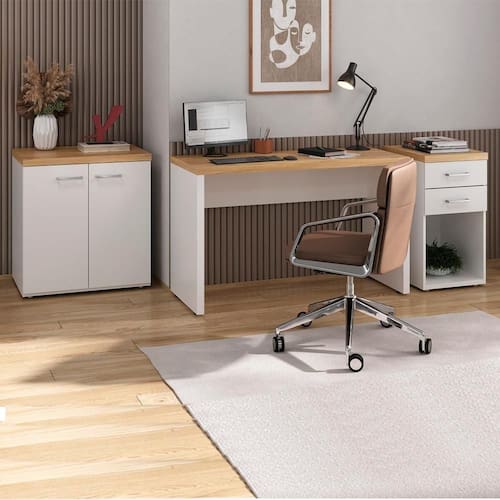 Escolha perfeita para quem busca móveis funcionais, sofisticado e de alta qualidade. Com design clean e minimalista, ele se adapta a diversos estilos de decoração, seja em um escritório corporativo, Home Office ou até mesmo no quarto, garantindo um toque de requinte e modernidade ao ambiente. Conjunto fabricado com tampo de Tamburato de 37mm, um material robusto e resistente que assegura durabilidade e um acabamento impecável. Com acabamento em BP, garante resistência a riscos, uniformidade nas cores assegurando um produto que se mantém como por muito mais tempo. Gaveteiro com duas amplas gavetas, oferece espaço suficiente para manter seus itens sempre organizados e acessíveis. Balcão Multifuncional, com capacidade de armazenamento, conta com uma ampla prateleira. Mesa com amplo espaço com tamanho ideal para organização e produtividade. Este móvel chegará em sua casa separado em 03 Volumes.