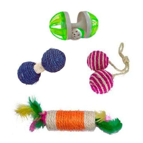 - o kit contém: 1 bola sisal com 2 unidades; 1 halteres sisal com corda; 1 cilindro com catnip; 1 bambolê com guizo.
