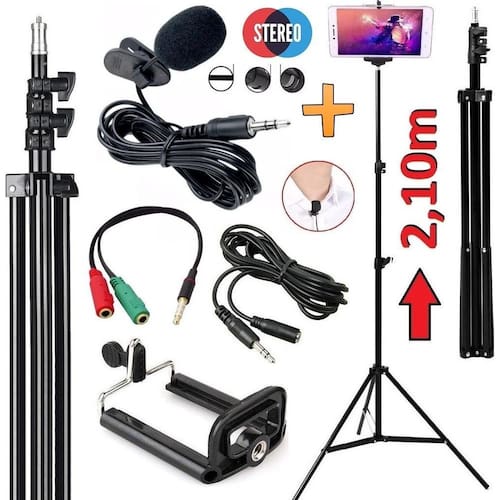 kit tripé 2,10m câmera celular microfone lapela + extensão + suporte celular
