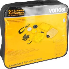 01 kit para limpeza, composto por: 1 luva microfibra multiuso C x L (25 cm x 18 cm) e 1 kit para polimento composto por: 1 suporte, 2 esponjas de microfibra e 1 esponja de espuma, 1 toalha (310GSM) microfibra VONDER C x L (60 cm x 40 cm), 1 esponja aplicadora multiuso C x L x A (12 cm x 4,2 cm x 6,5 cm) - Suporte: polipropileno/espuma EVA, 1 escova para limpeza de tapetes/carpetes C x L x A (18,5 cm x 8,5 cm x 10 cm) cerdas em nylon com cabo plástico, 1 escova para furos de rodas tipo pepino C x L x A (29 cm x 7,5 cm x 7 cm) - cerdas em nylon com cabo plástico e 1 luva de lã sintética para polimento C x L (25 cm x 19 cm) - 100% poliéster.