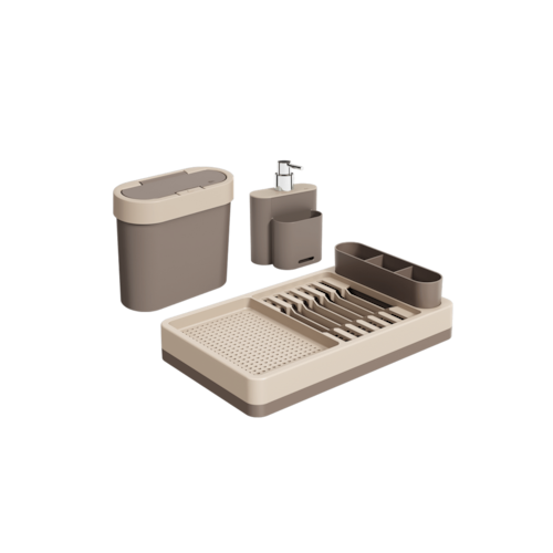 Deixar a bancada da sua pia organizada e funcional é possível com o Kit Pia da Coza. O conjunto é composto por escorredor de louças que tem bandeja coletora de água que mantém a superfície sempre seca. Além disso, possui , escorredor de louças com espaço para até 6 pratos e 6 copos e escorredor de talheres removível; dispenser de detergente com capacidade para 500ml e espaço para guardar a esponja com abertura frontal para escoamento do excesso de água; lixeira com capacidade para 2,8l com formato que otimiza espaços, tampa que esconde a sacola e encaixe do prato que facilita o descarte de alimentos.